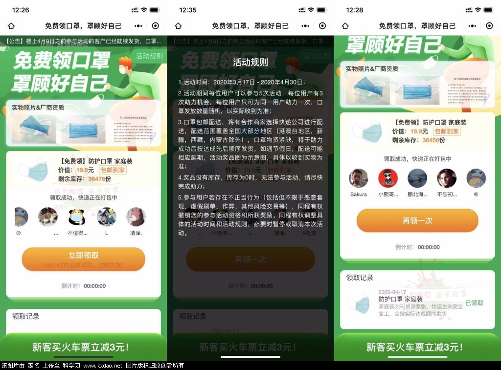 wx扫码进入助力->生成自己的链接->喊10个好友点一下助力即可领取3只口罩包邮!