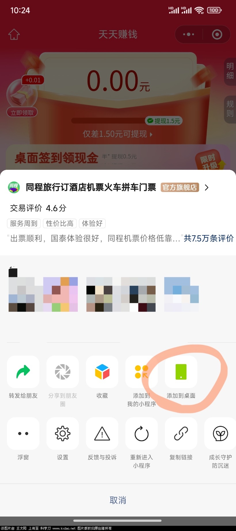 将同程旅行小程序添加到桌面,然后在桌面进入小程序活动页面点签到提现秒到,不知道怎么添加的可以看图二